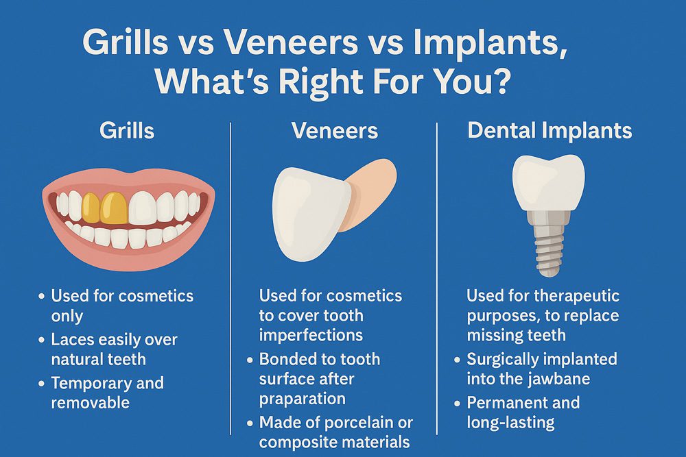 Titanium grillz are intended for cosmetic purposes without previous issues in the teeth, as mentioned, but other traditional dental treatments, such as veneers and crowns, are for medical and cosmetic purposes. veneers are typically used to cover the front of discoloured or broken teeth, and crowns provide full coverage to the whole tooth due to its damage.